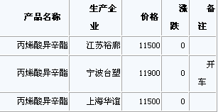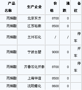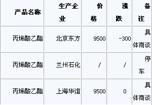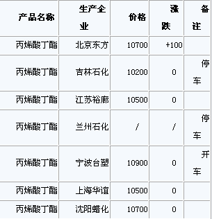 周四早市,沈阳蜡化上调报价:丙烯酸丁酯10800元/吨,丙烯酸甲酯9000元/吨,丙烯酸乙酯9400元/吨,丙烯酸普酸8400元/...
